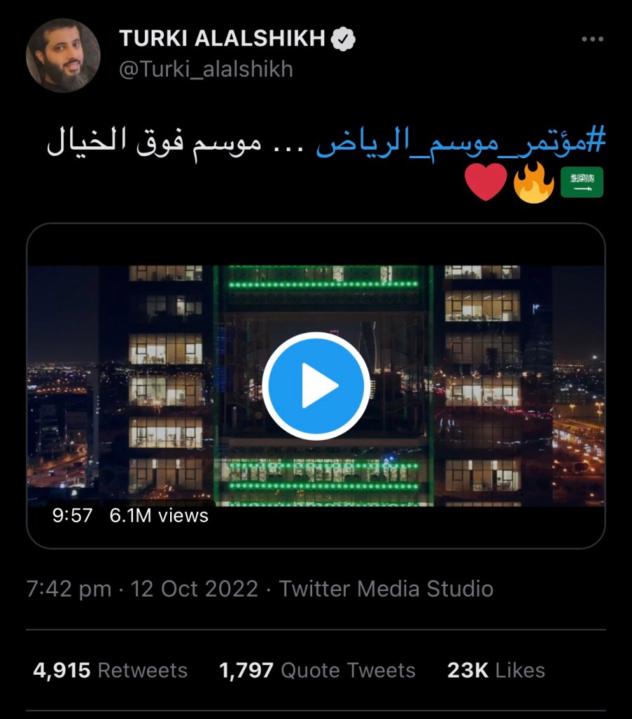أعلن رئيس مجلس إدارة الهيئة العامة للترفيه بالسعودية تركي بن عبدالمحسن آل الشيخ، الأربعاء، موعد إطلاق موسم الرياض 2022، تحت شعار “فوق الخيال”، حيث تبدأ فعالياته يوم 21 أكتوبر الجاري بحفل عالمي يضم عرضا لسيرك دو سوليه.